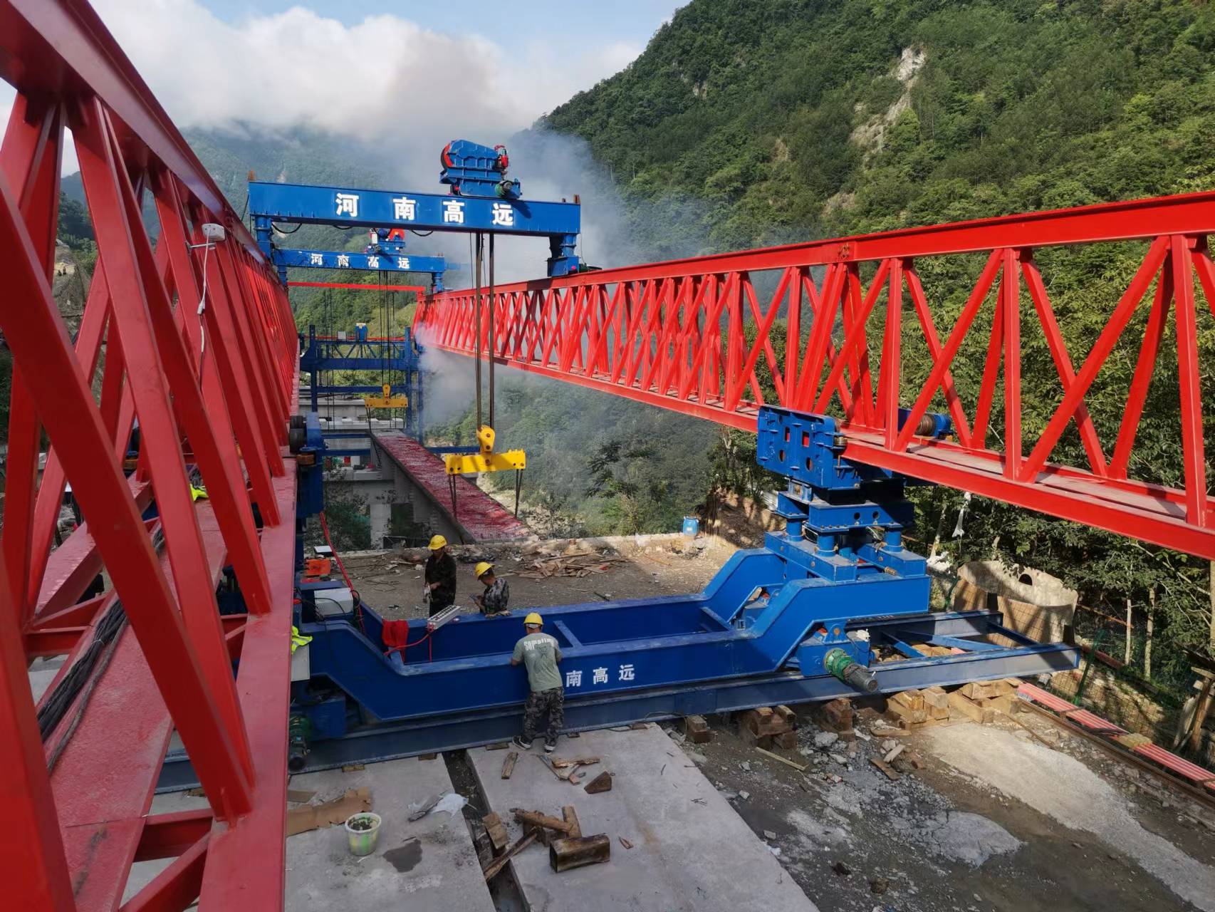 架橋機主要由主梁、懸臂梁、下導梁、前后支腿、輔支腿、吊梁行車、懸臂吊及電液系統組成。適用于三種不同跨徑單跨簡支梁的架設,作業效率高。本類型架橋機能夠架設直線、曲線、縱坡的等跨及變跨雙線預應力混凝土整孔箱梁。該 架橋機除了能夠進行標準架設作業外,還能滿足首末跨架設、曲線架設、變跨架設、跨連續梁、結合梁、連續鋼構等。既有橋梁架設、簡支變跨連續架設等工況施工。具有簡支架設、定點起吊、梁體吊裝穩定性好、作業效率高、安全可靠、變跨調整方便、操作方便等特點。
